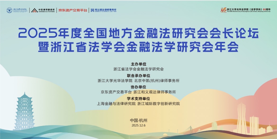 2025年12月6日,2025年度全国地方金融法研究会会长论坛暨浙江省法学会金融法学研究会年会在杭州隆重召开。本次论坛由浙江省法学会金融法学研究会主办,浙江大学光华法学院等单位联合承办,上海金融与法律研究院、浙江城际数字创新研究院提供学术支持,来自全国各地的200余名金融法领域专家、学者、实务工作者参会,以“法治中国建设的金融法贡献”为总主题展开多维度研讨。