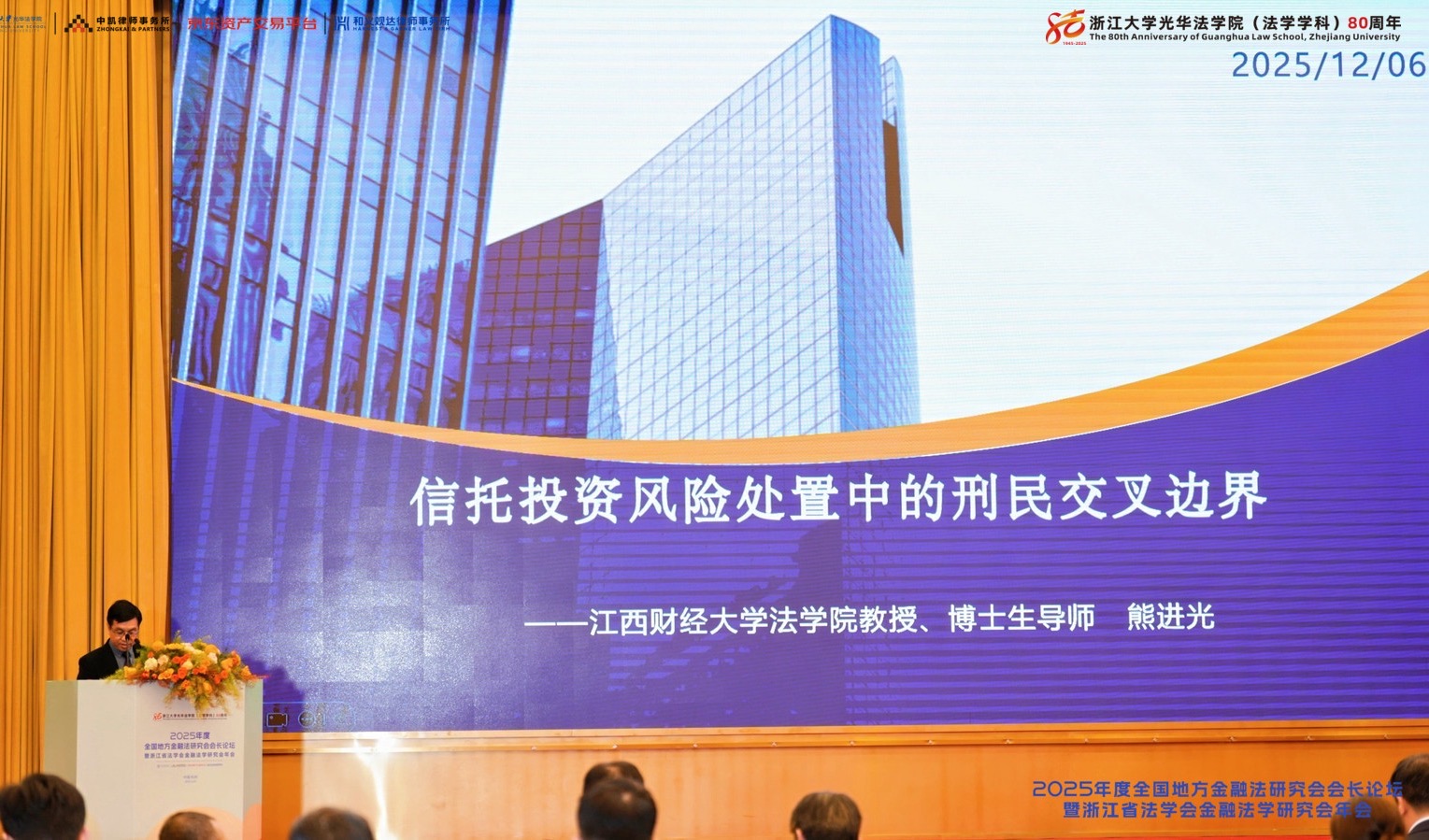 在“金融市场监管前沿法律问题”专题研讨环节,熊进光教授以《信托投资风险处置中的刑民交叉边界》为题发表了演讲。